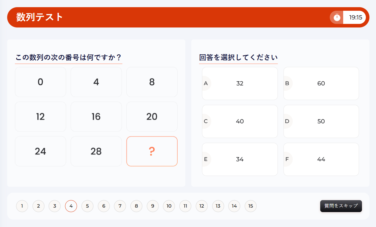 数字の並びの問題では、数字の並びにおけるパターンを識別し予測する能力が試されます。これらの問題には、欠けている数字を見つけたり、次の数字を決定したり、基本的なルールを見極めたりするものがあります。