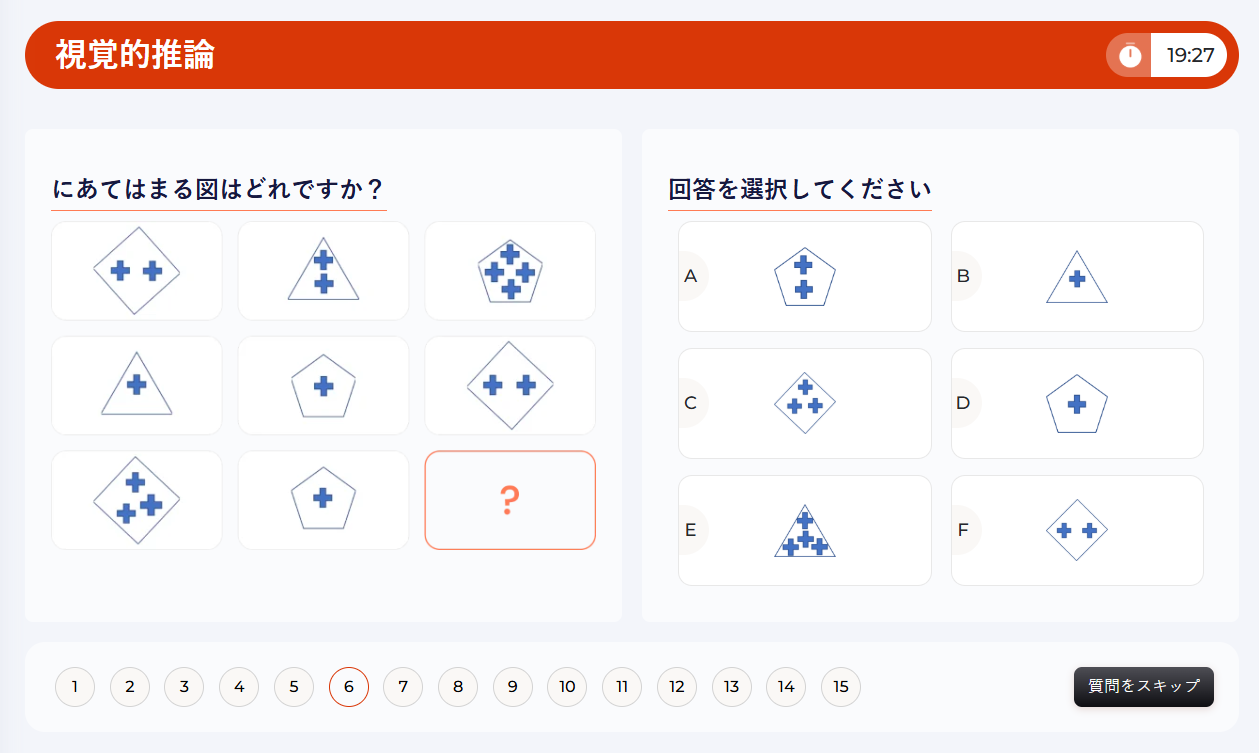 視覚的/空間的な課題には、パターンの識別、物体の回転イメージ、空間的な問題解決、複雑な構造の視覚化などが含まれます。